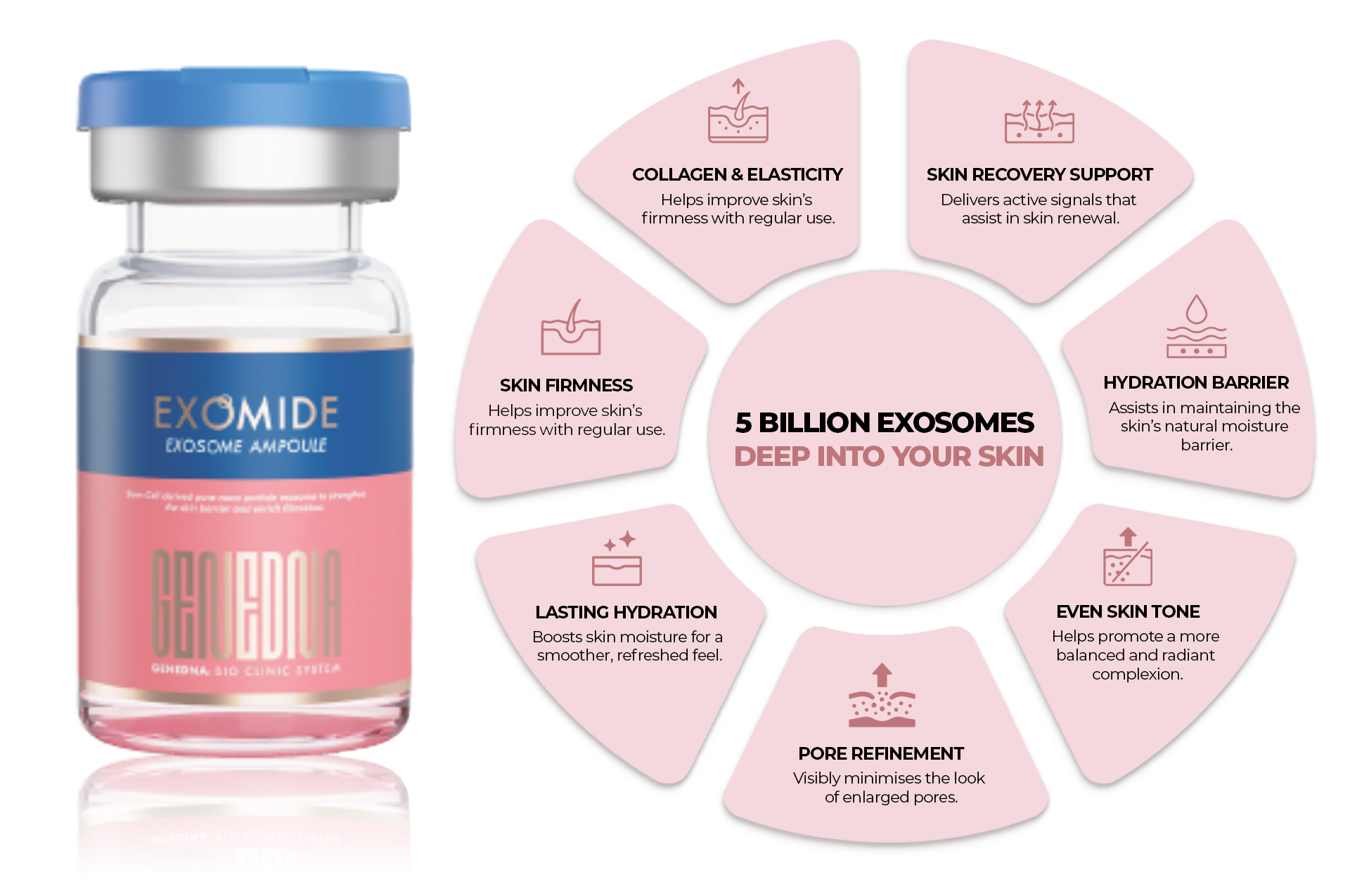 Exomide™ is developed in South Korea by Cosmedician, a global leader in regenerative aesthetic science. Each vial contains 5 billion exosomes, plus amino acids, peptides, and growth factors to support advanced skin rejuvenation.